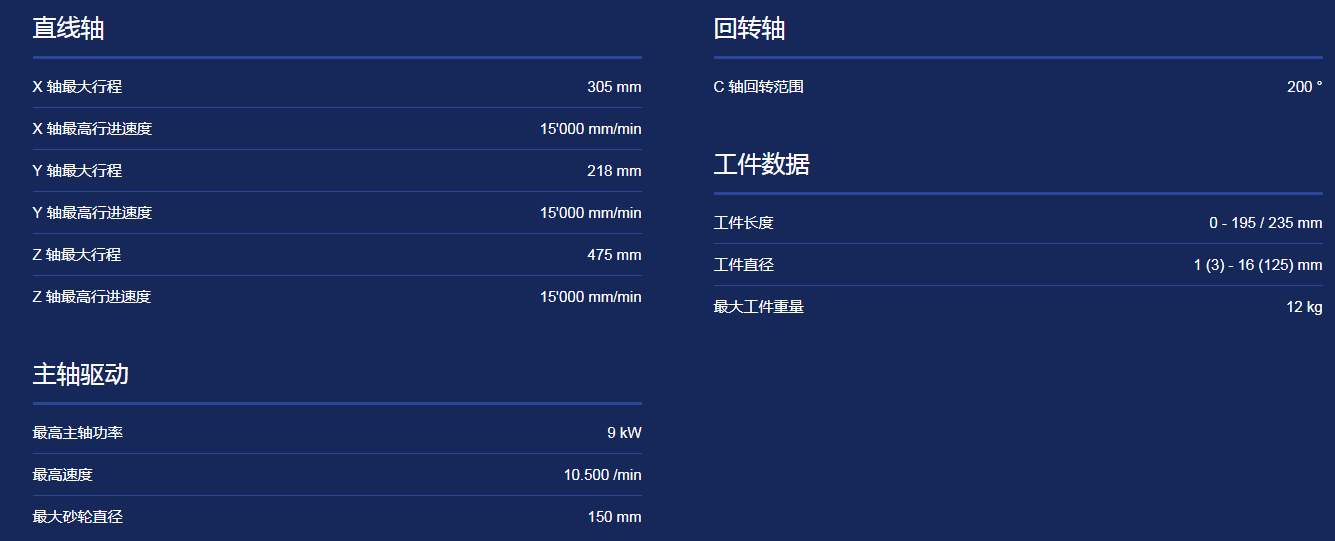 適用于生產(chǎn)和重磨直徑范圍從 1 到 125 mm 的旋轉(zhuǎn)對(duì)稱刀具。可加工長(zhǎng)度最大 235 mm、單件重量不超過(guò) 12 kg 的刀具。